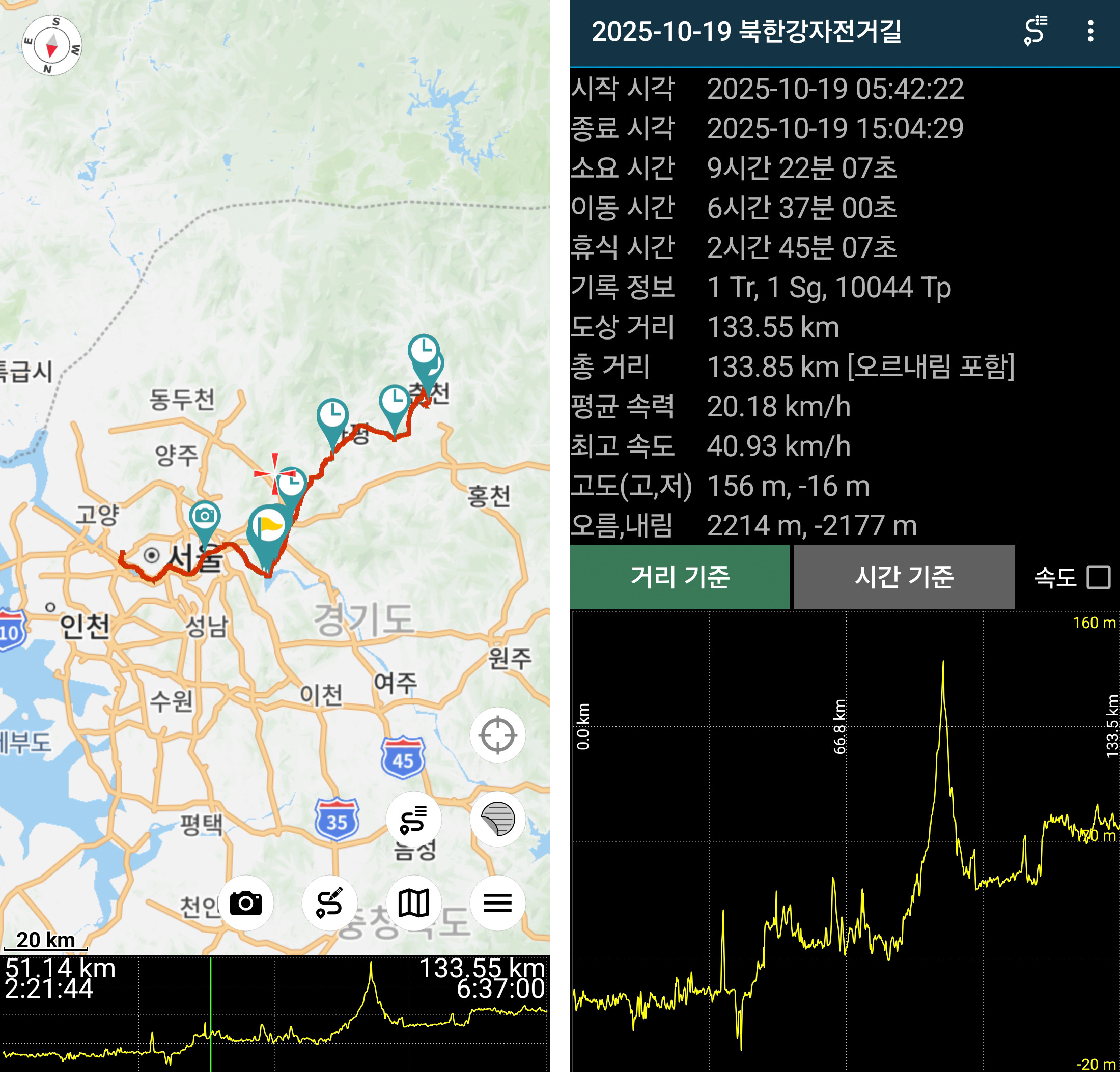 - 능내역(0805) - 밝은광장(0819~0835) - 양주CC 언저리 아침식사(0909~1011) - 샛터삼거리(1010)